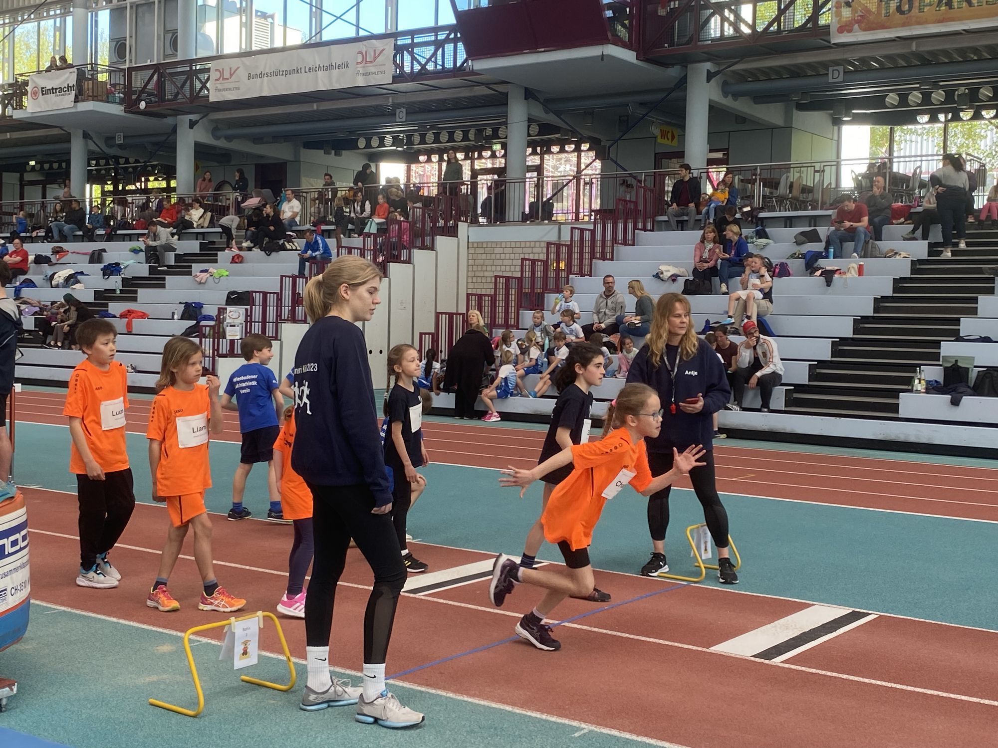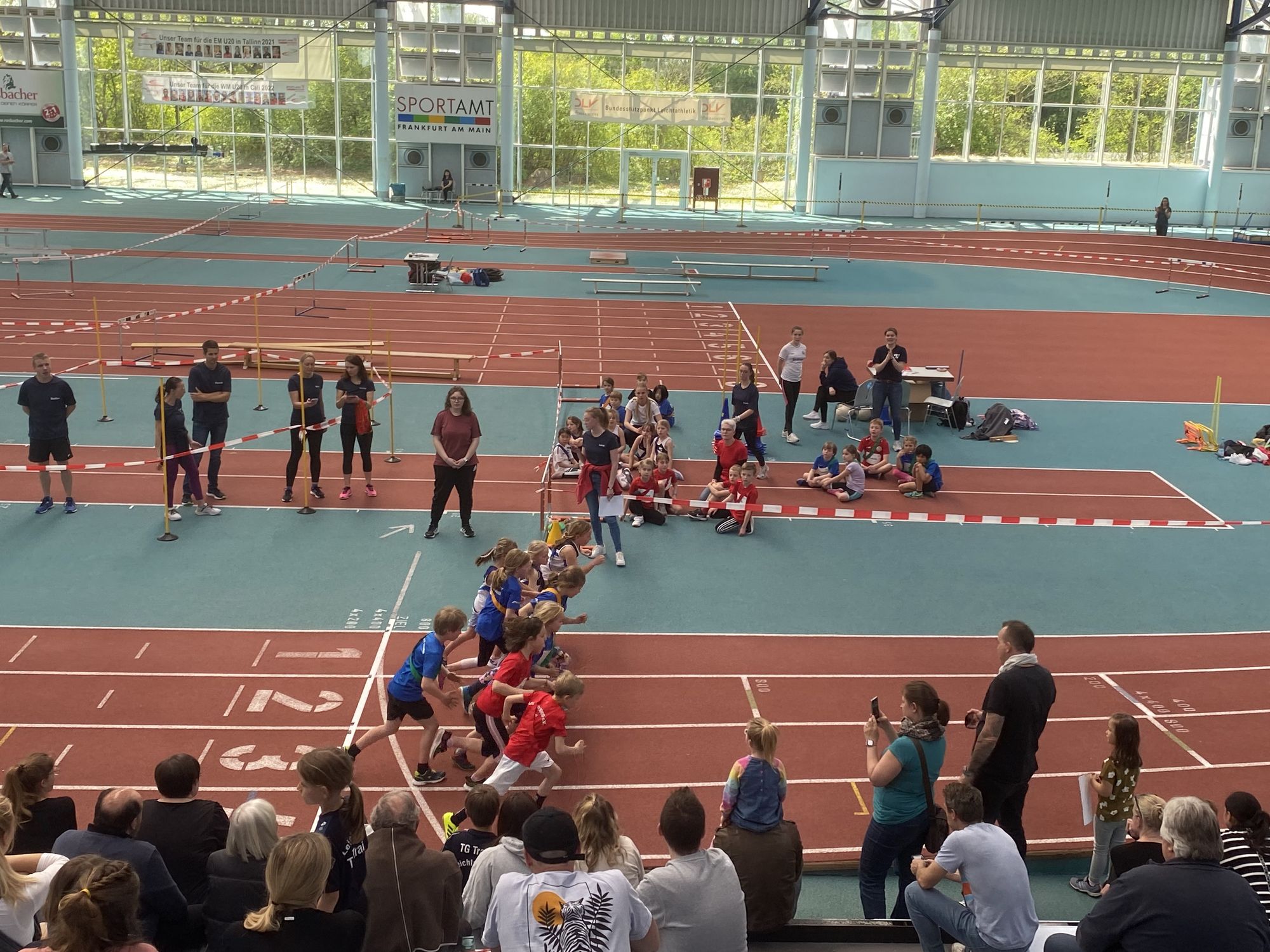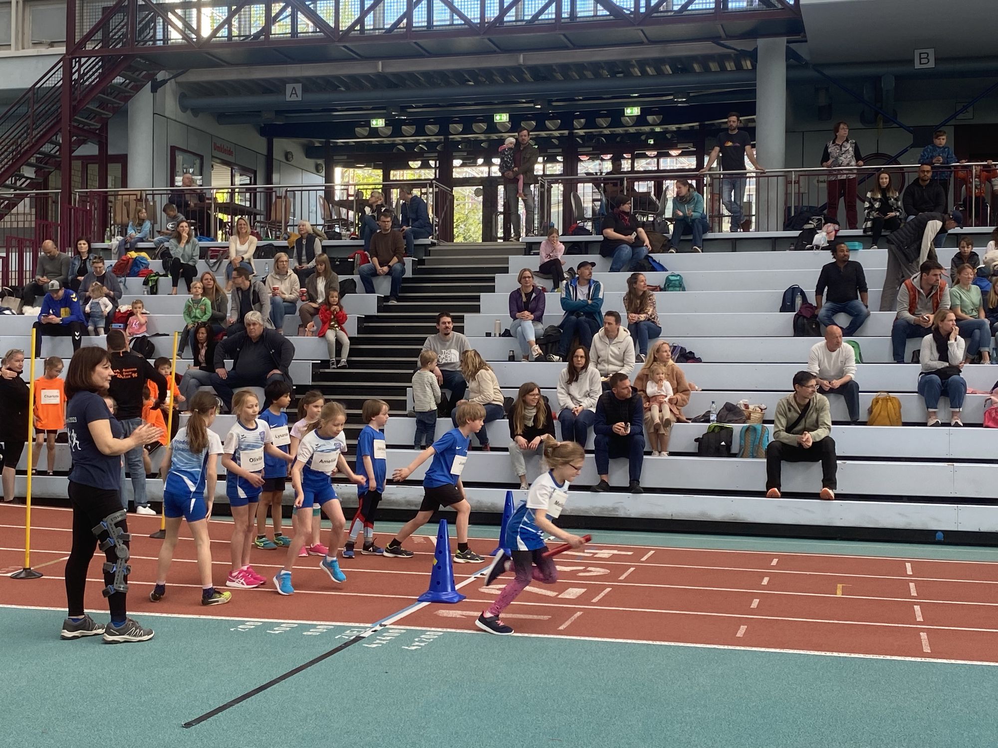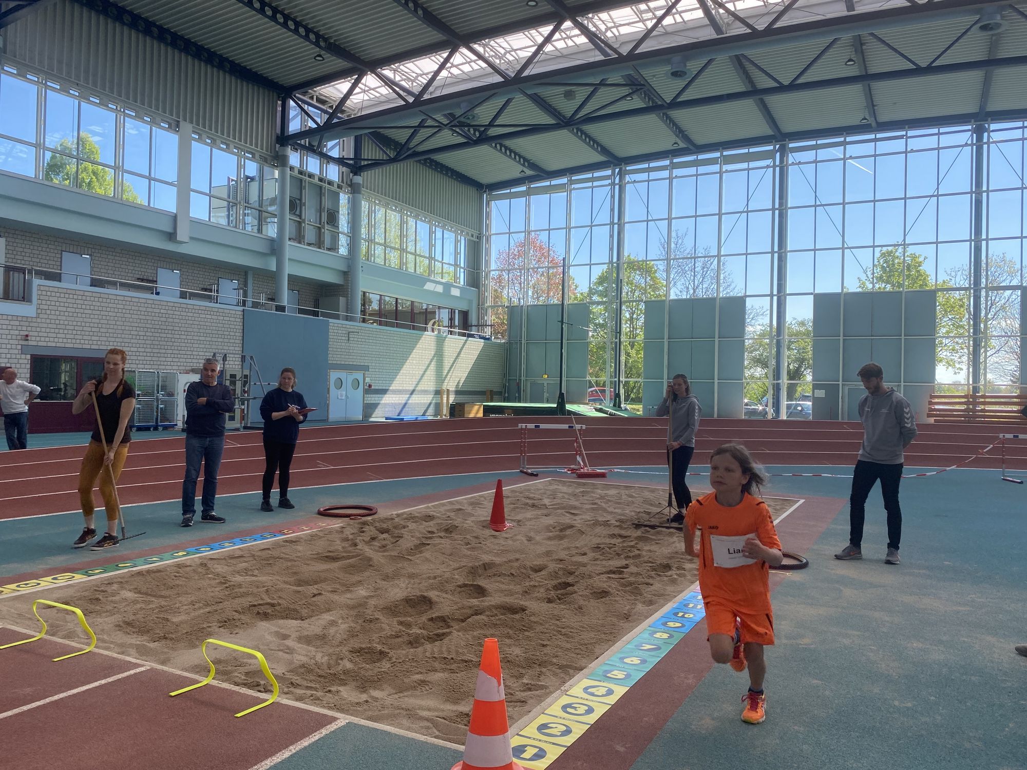 Es waren 16 Teams und somit über 140 Kinder gemeldet, die nun fünf Kinderleichtathletik-Disziplinen vor sich hatten. Als um 10 Uhr der Startschuss in der Leichtathletikhalle Kalbach ertönte, war es an den Kindern zu zeigen, was sie in ihrem jungen U10 Alter schon können. Als erstes wurde die ganze Leichtathletikhalle hergerichtet, so dass 8 Teams gleichzeitig die Hindernis-Sprintstaffel bestreiten konnten - ein beeindruckendes Bild. Nachdem das geschafft war, blieben noch der Drehwurf, das Medizinballstoßen und die Weitsprung-Staffel, bis abschließend der Team-Biathlon anstand. Die Atmosphäre war dank motivierter Kinder, gut gelaunter Eltern und toller Musik perfekt. Außerdem war das DLV-Maskottchen JuLe anwesend und sorgte für Stimmung. Alles in allem ein gelungener KiLa-Wettkampf - doch für die C-Trainer*innen war die Arbeit noch nicht getan.