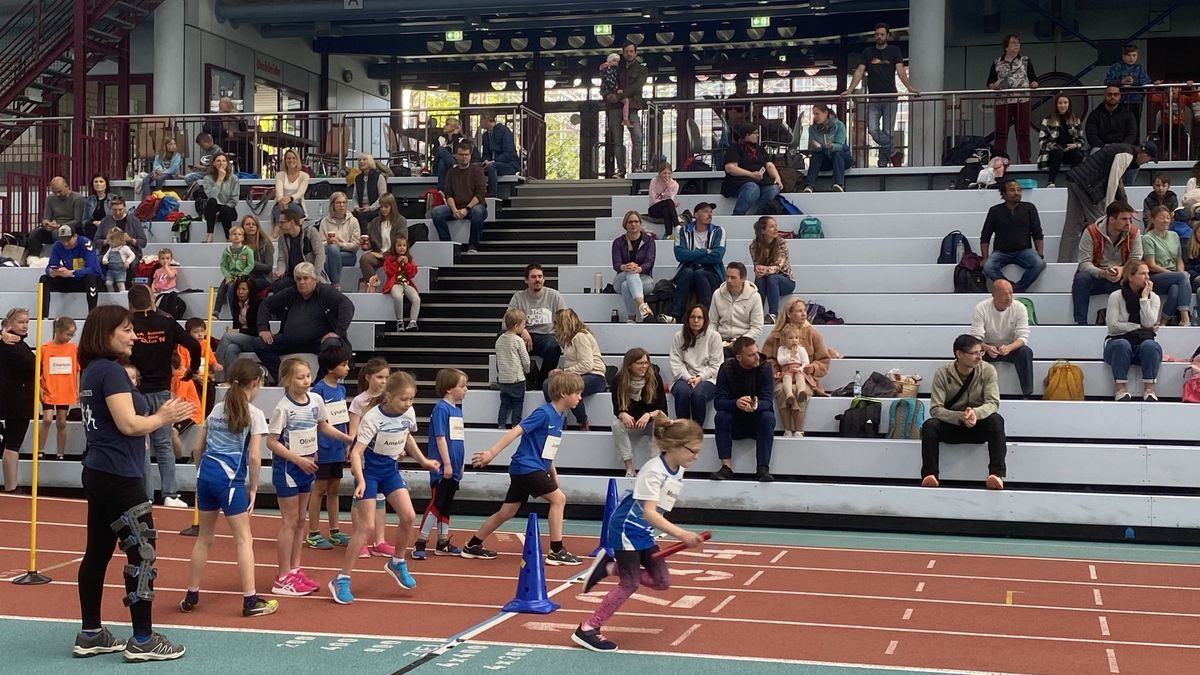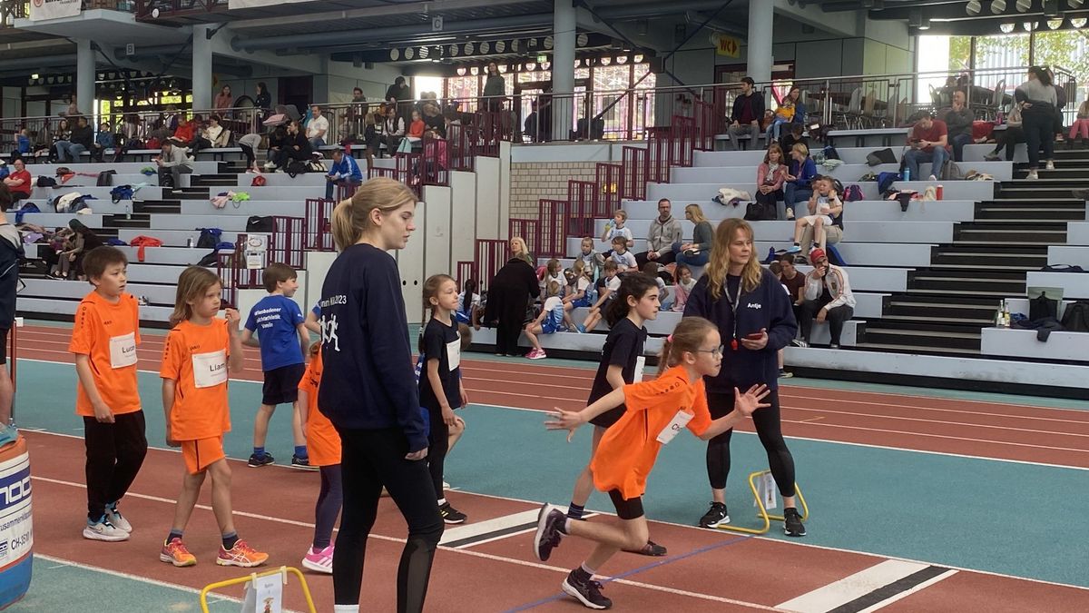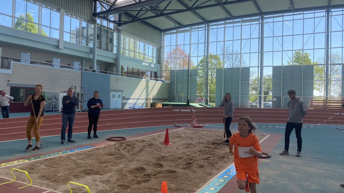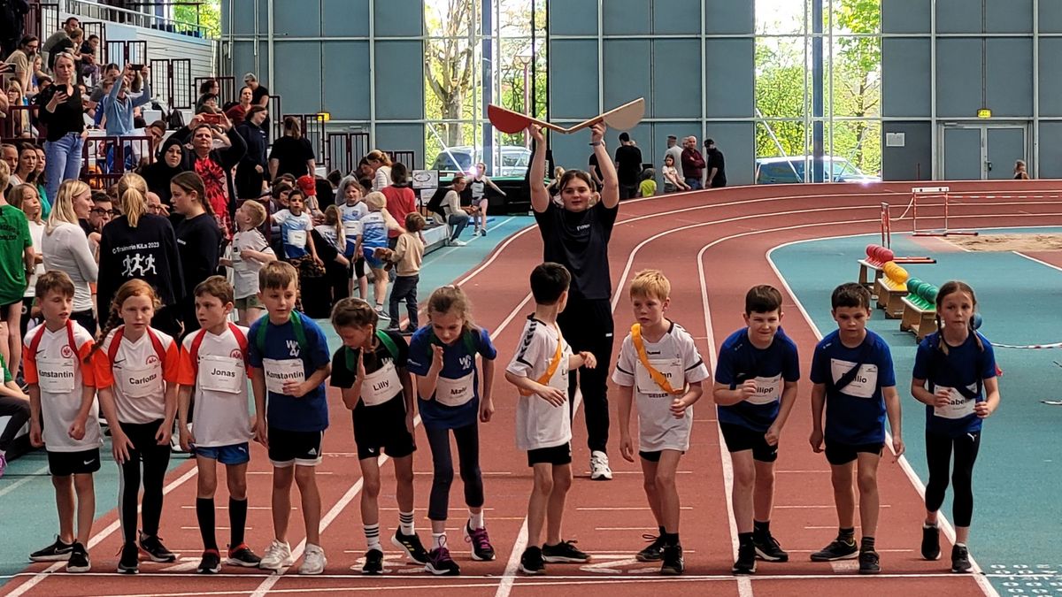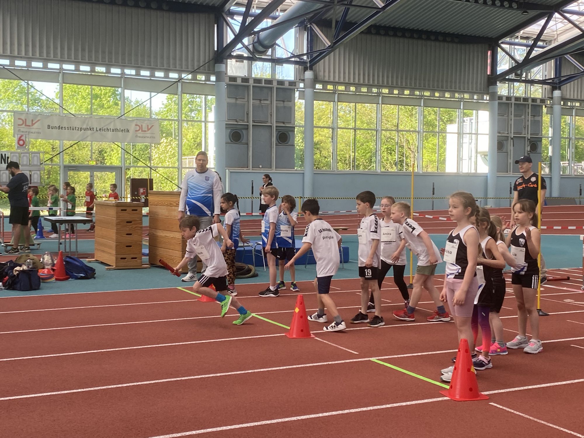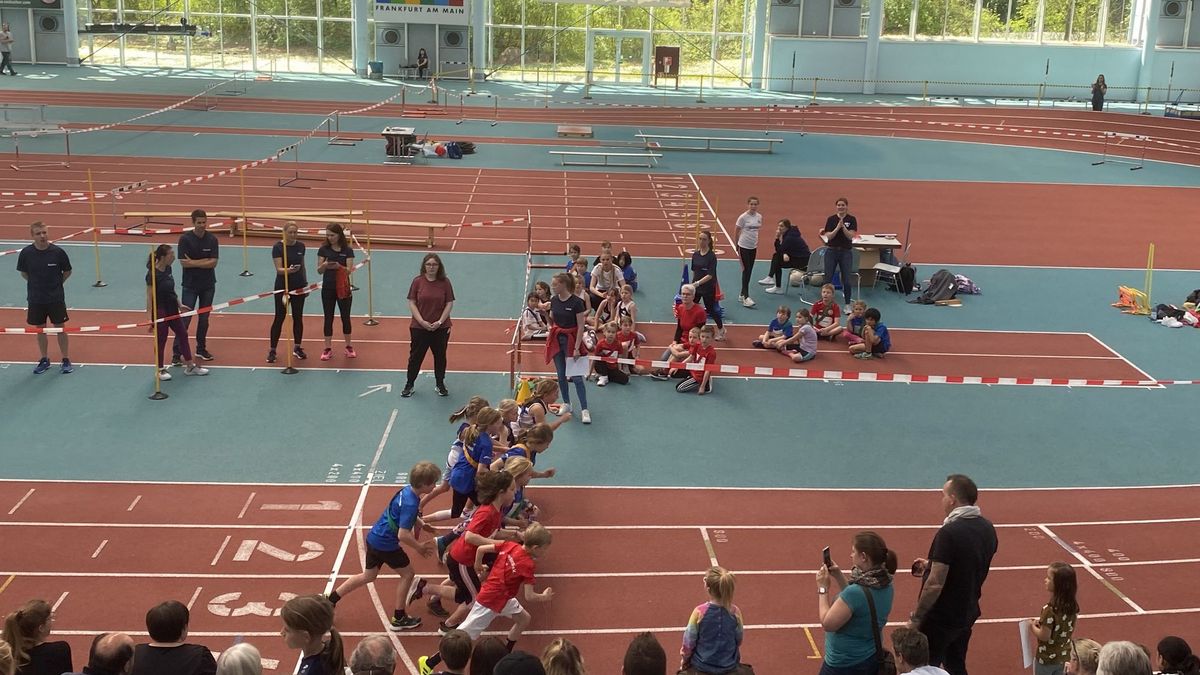 Es waren 16 Teams und somit über 140 Kinder gemeldet, die nun fünf Kinderleichtathletik-Disziplinen vor sich hatten. Als um 10 Uhr der Startschuss in der Leichtathletikhalle Kalbach ertönte, war es an den Kindern zu zeigen, was sie in ihrem jungen U10 Alter schon können. Als erstes wurde die ganze Leichtathletikhalle hergerichtet, so dass 8 Teams gleichzeitig die Hindernis-Sprintstaffel bestreiten konnten - ein beeindruckendes Bild. Nachdem das geschafft war, blieben noch der Drehwurf, das Medizinballstoßen und die Weitsprung-Staffel, bis abschließend der Team-Biathlon anstand. Die Atmosphäre war dank motivierter Kinder, gut gelaunter Eltern und toller Musik perfekt. Außerdem war das DLV-Maskottchen JuLe anwesend und sorgte für Stimmung. Alles in allem ein gelungener KiLa-Wettkampf - doch für die C-Trainer*innen war die Arbeit noch nicht getan.