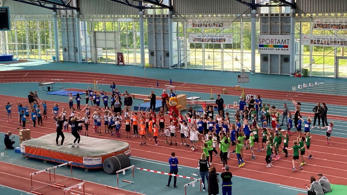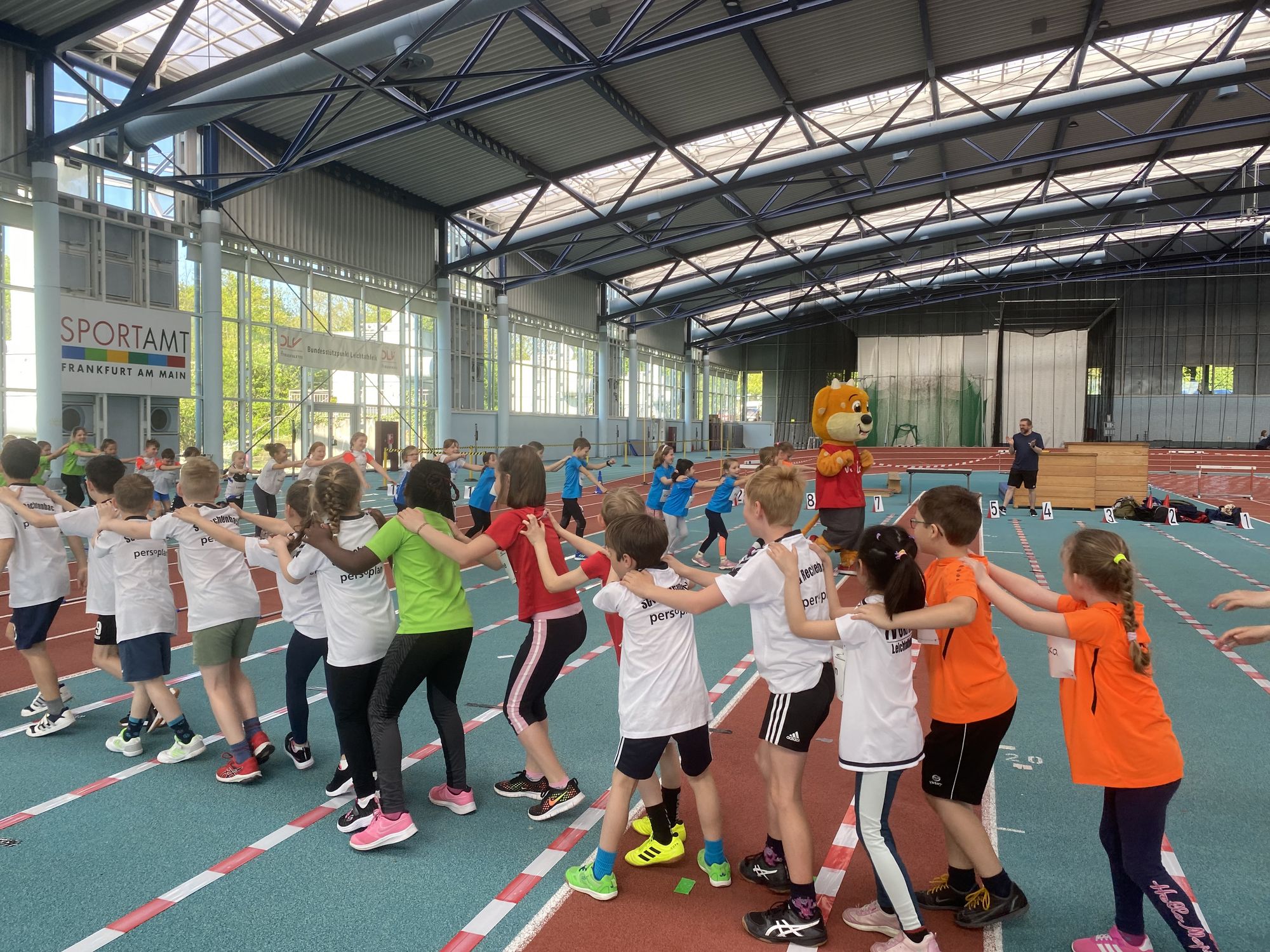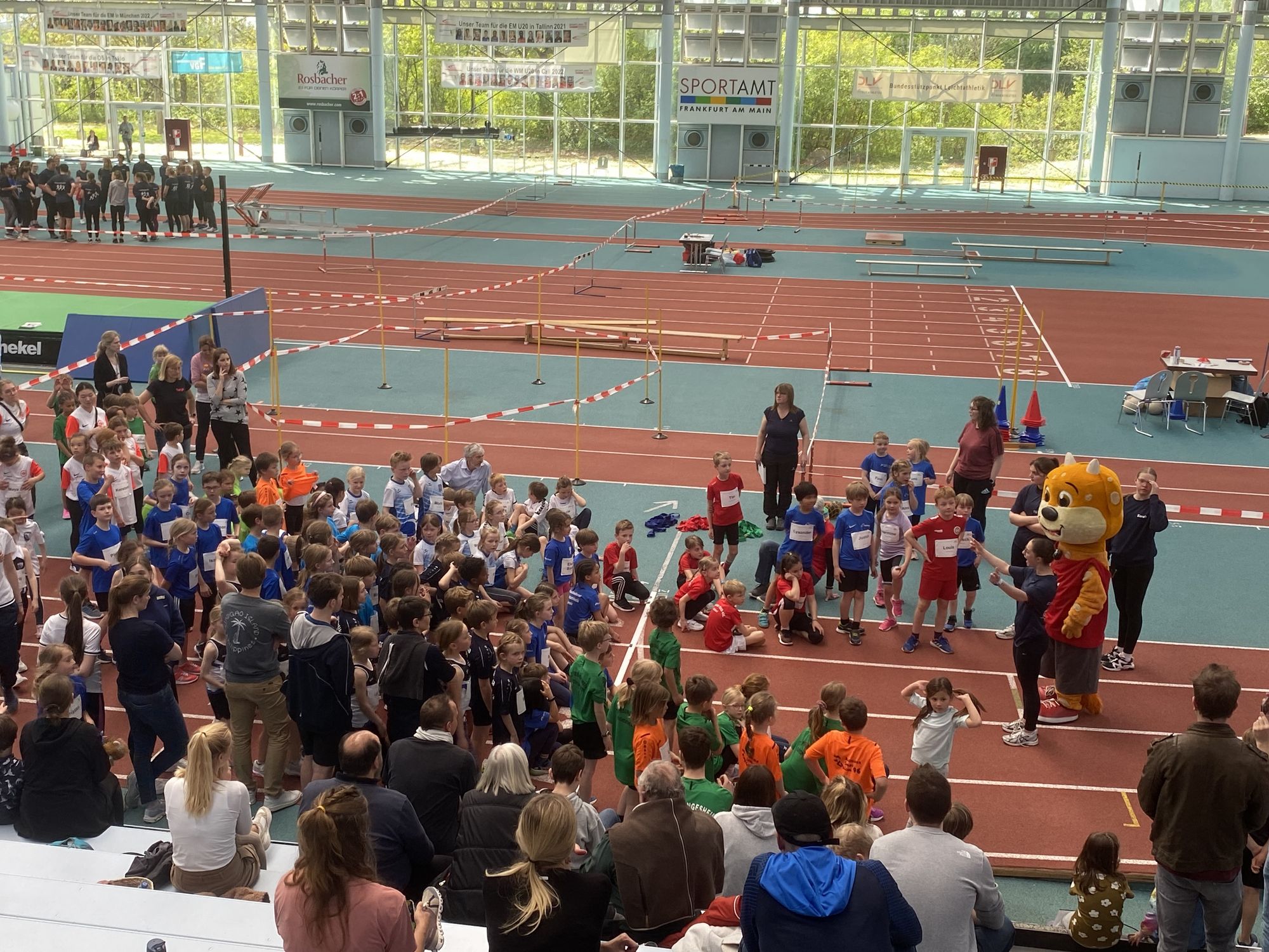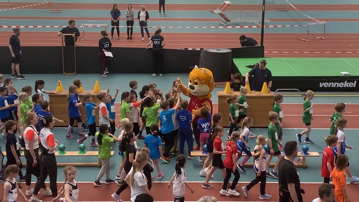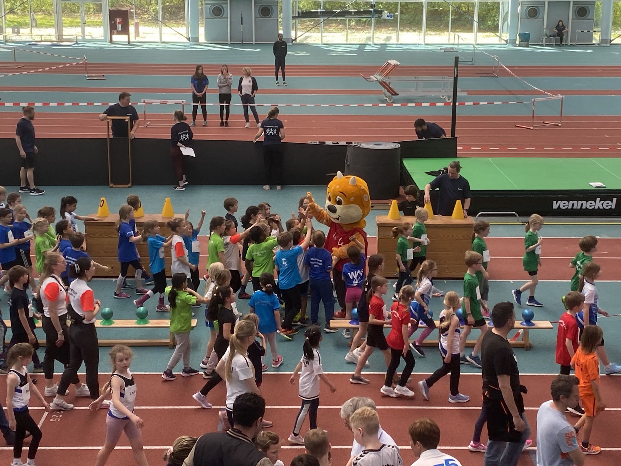 Es waren 16 Teams und somit über 140 Kinder gemeldet, die nun fünf Kinderleichtathletik-Disziplinen vor sich hatten. Als um 10 Uhr der Startschuss in der Leichtathletikhalle Kalbach ertönte, war es an den Kindern zu zeigen, was sie in ihrem jungen U10 Alter schon können. Als erstes wurde die ganze Leichtathletikhalle hergerichtet, so dass 8 Teams gleichzeitig die Hindernis-Sprintstaffel bestreiten konnten - ein beeindruckendes Bild. Nachdem das geschafft war, blieben noch der Drehwurf, das Medizinballstoßen und die Weitsprung-Staffel, bis abschließend der Team-Biathlon anstand. Die Atmosphäre war dank motivierter Kinder, gut gelaunter Eltern und toller Musik perfekt. Außerdem war das DLV-Maskottchen JuLe anwesend und sorgte für Stimmung. Alles in allem ein gelungener KiLa-Wettkampf - doch für die C-Trainer*innen war die Arbeit noch nicht getan.