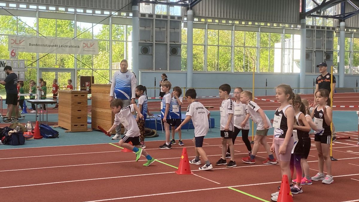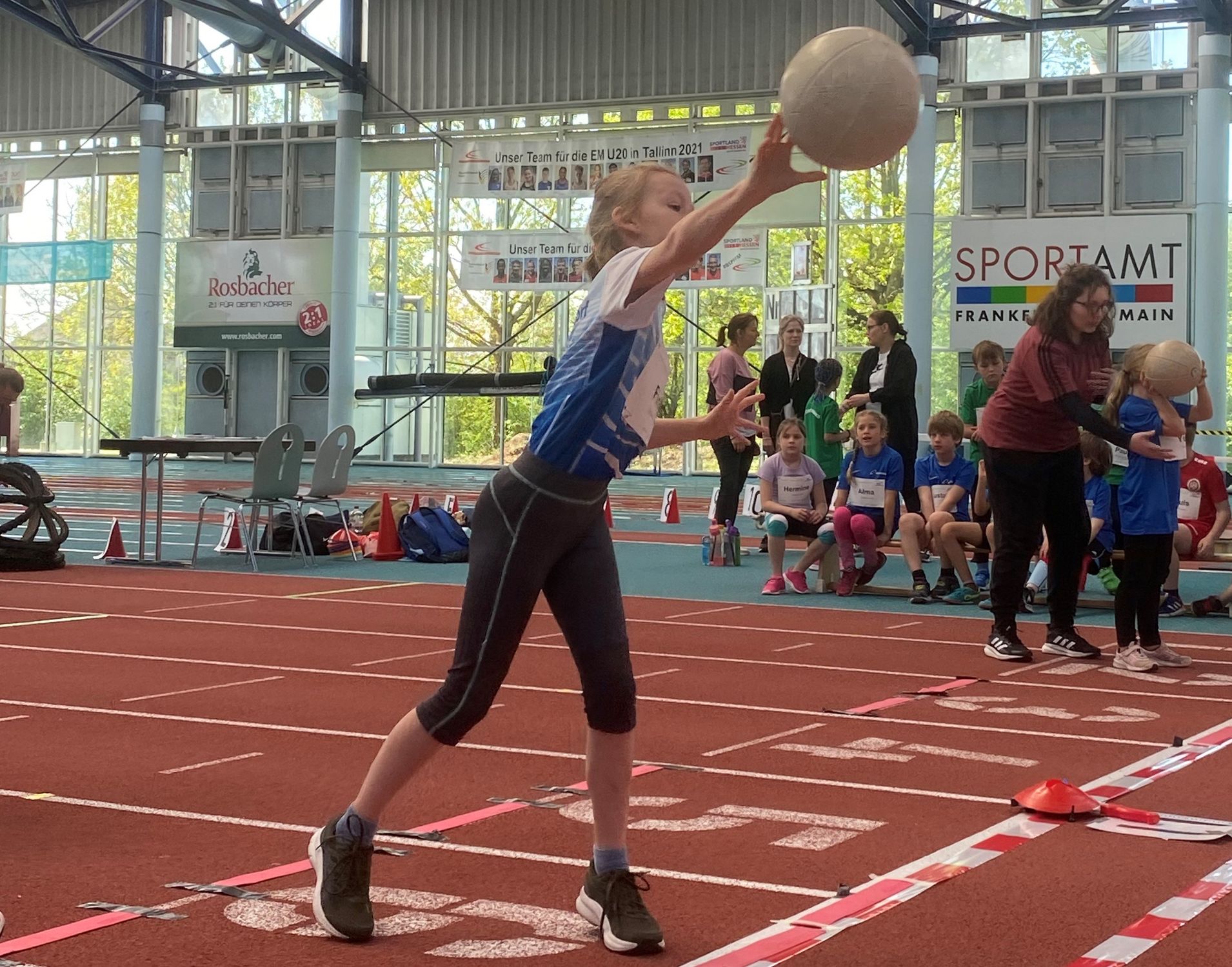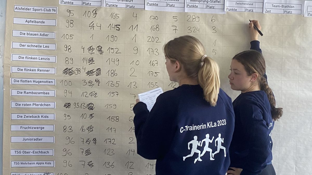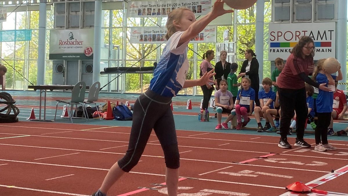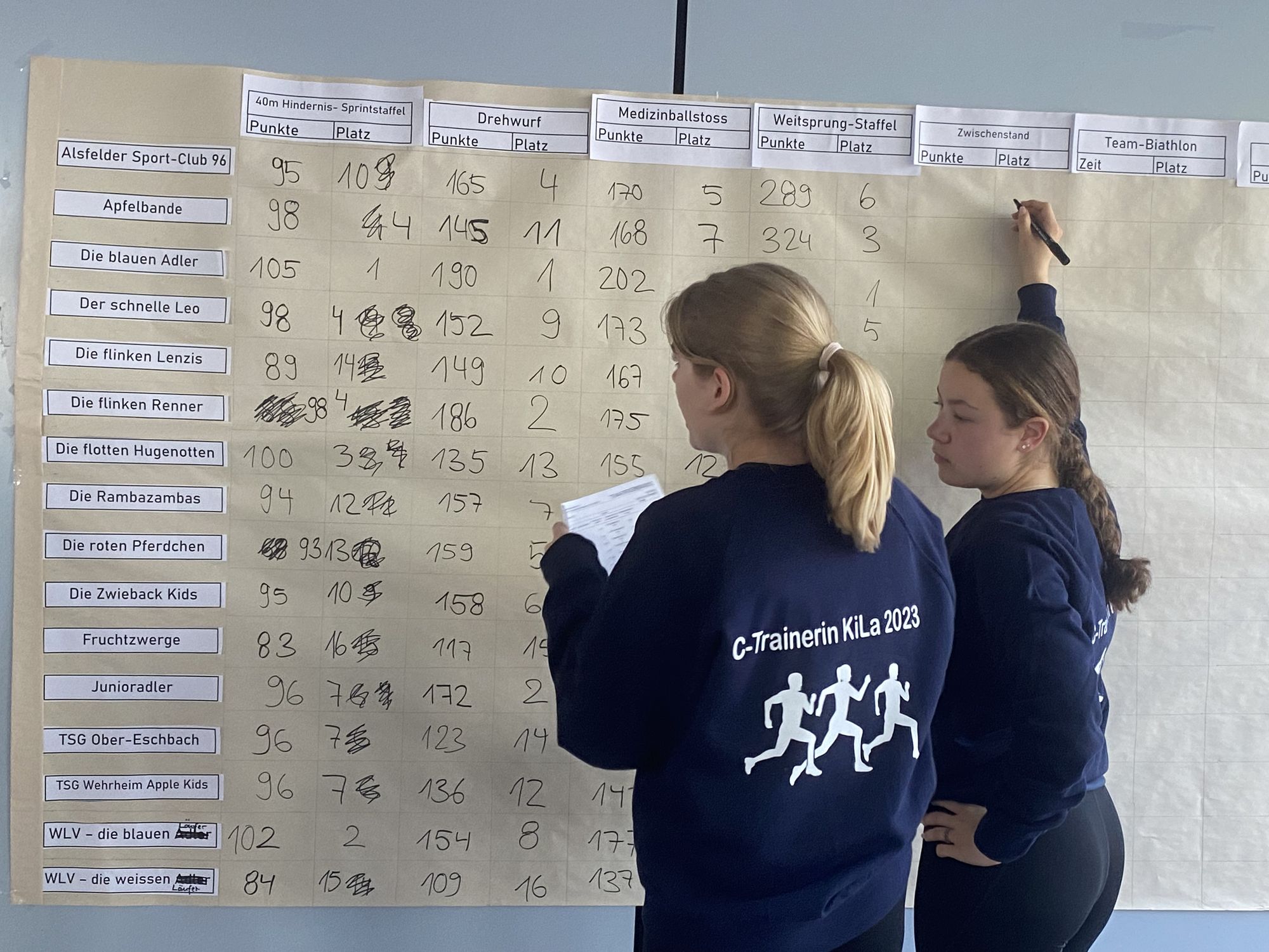 Es waren 16 Teams und somit über 140 Kinder gemeldet, die nun fünf Kinderleichtathletik-Disziplinen vor sich hatten. Als um 10 Uhr der Startschuss in der Leichtathletikhalle Kalbach ertönte, war es an den Kindern zu zeigen, was sie in ihrem jungen U10 Alter schon können. Als erstes wurde die ganze Leichtathletikhalle hergerichtet, so dass 8 Teams gleichzeitig die Hindernis-Sprintstaffel bestreiten konnten - ein beeindruckendes Bild. Nachdem das geschafft war, blieben noch der Drehwurf, das Medizinballstoßen und die Weitsprung-Staffel, bis abschließend der Team-Biathlon anstand. Die Atmosphäre war dank motivierter Kinder, gut gelaunter Eltern und toller Musik perfekt. Außerdem war das DLV-Maskottchen JuLe anwesend und sorgte für Stimmung. Alles in allem ein gelungener KiLa-Wettkampf - doch für die C-Trainer*innen war die Arbeit noch nicht getan.