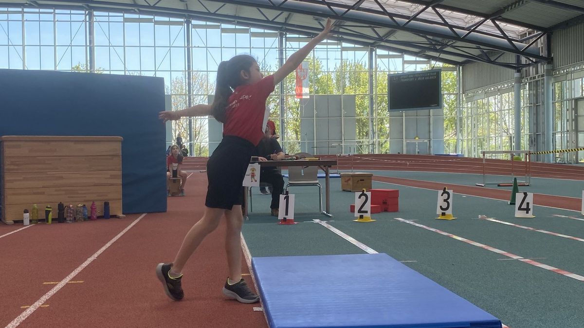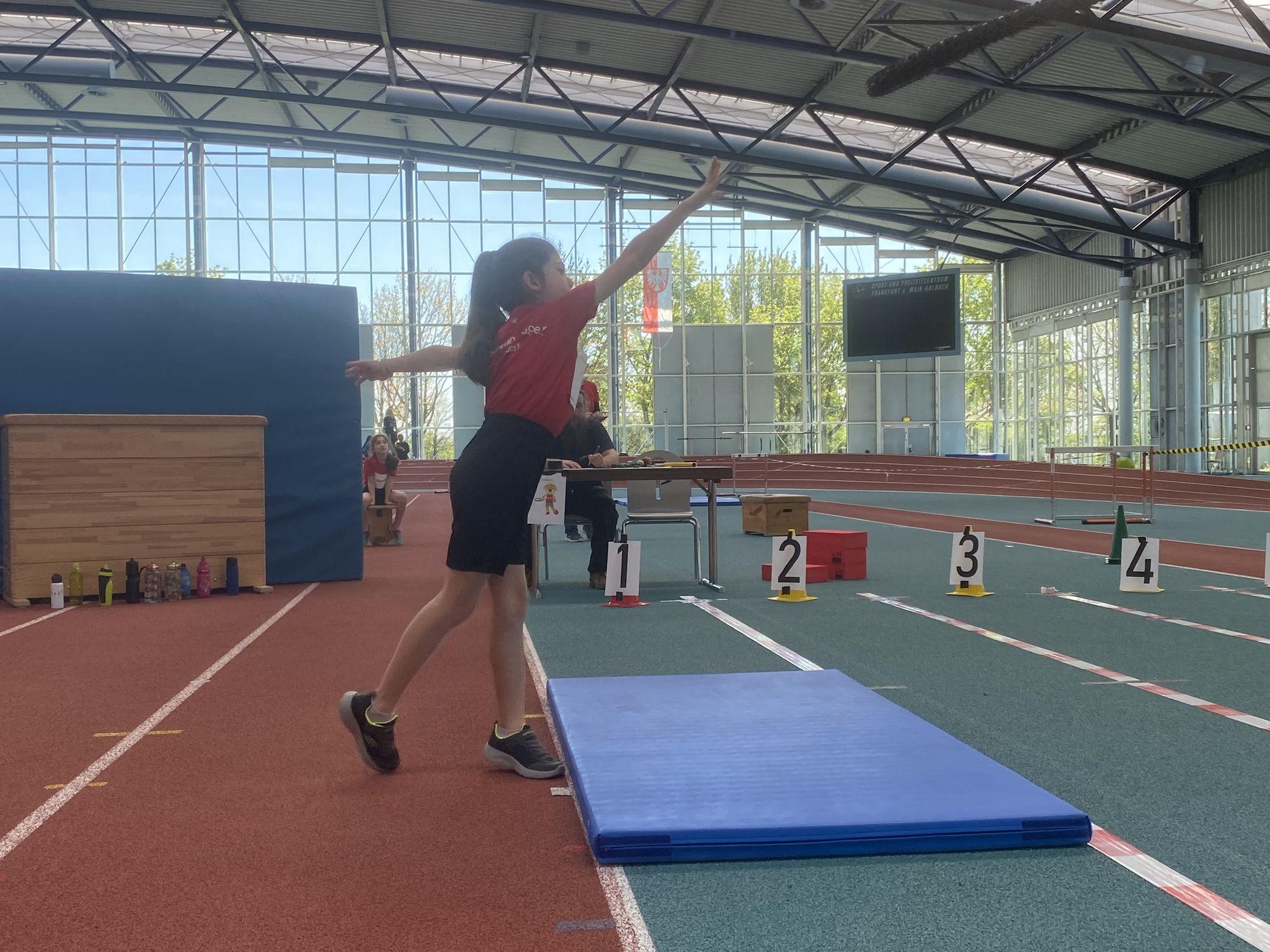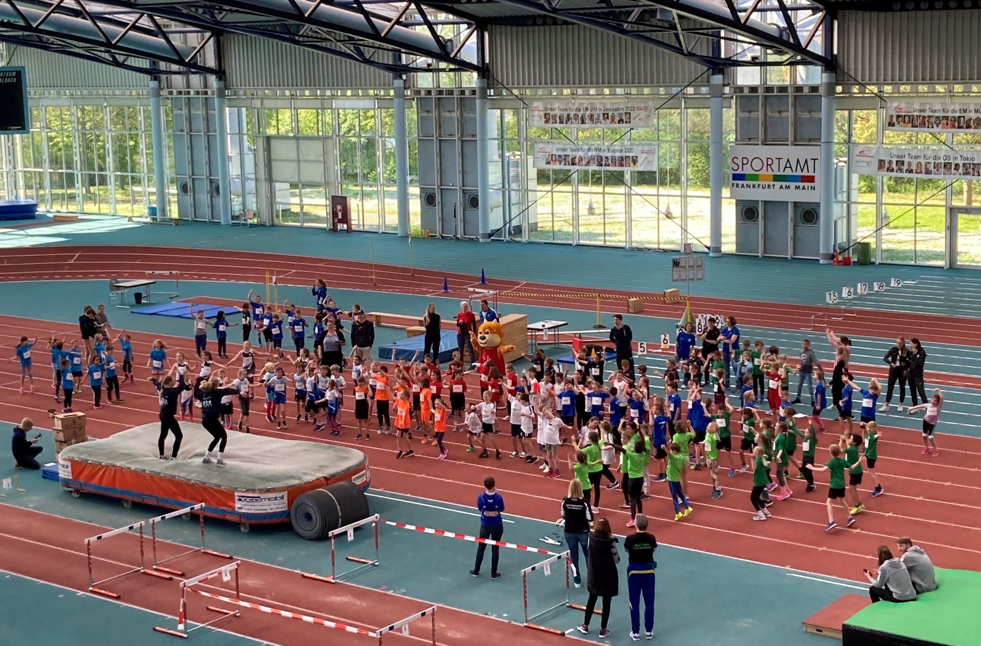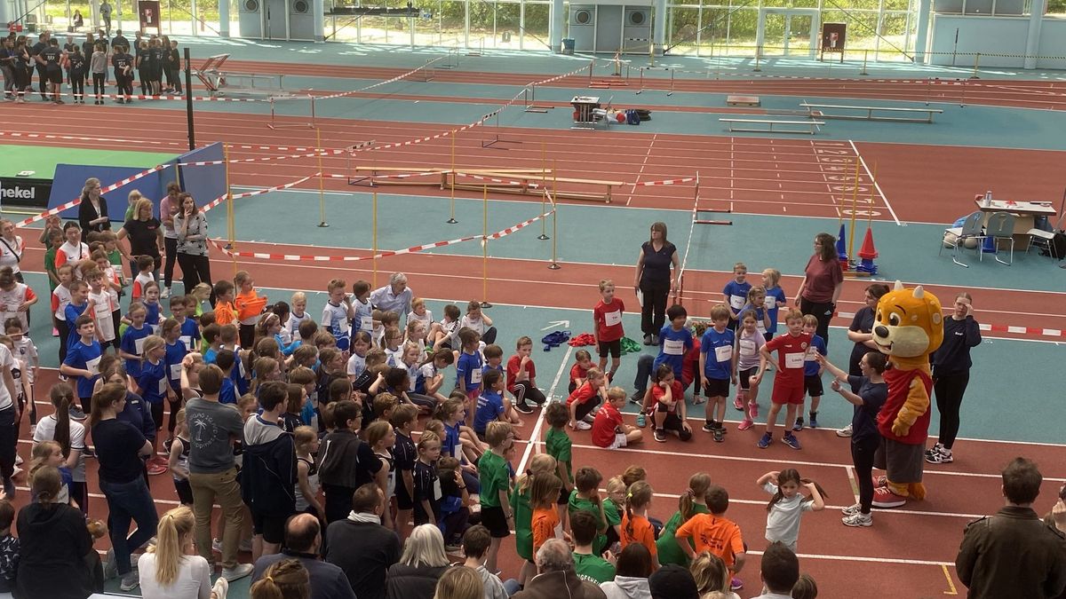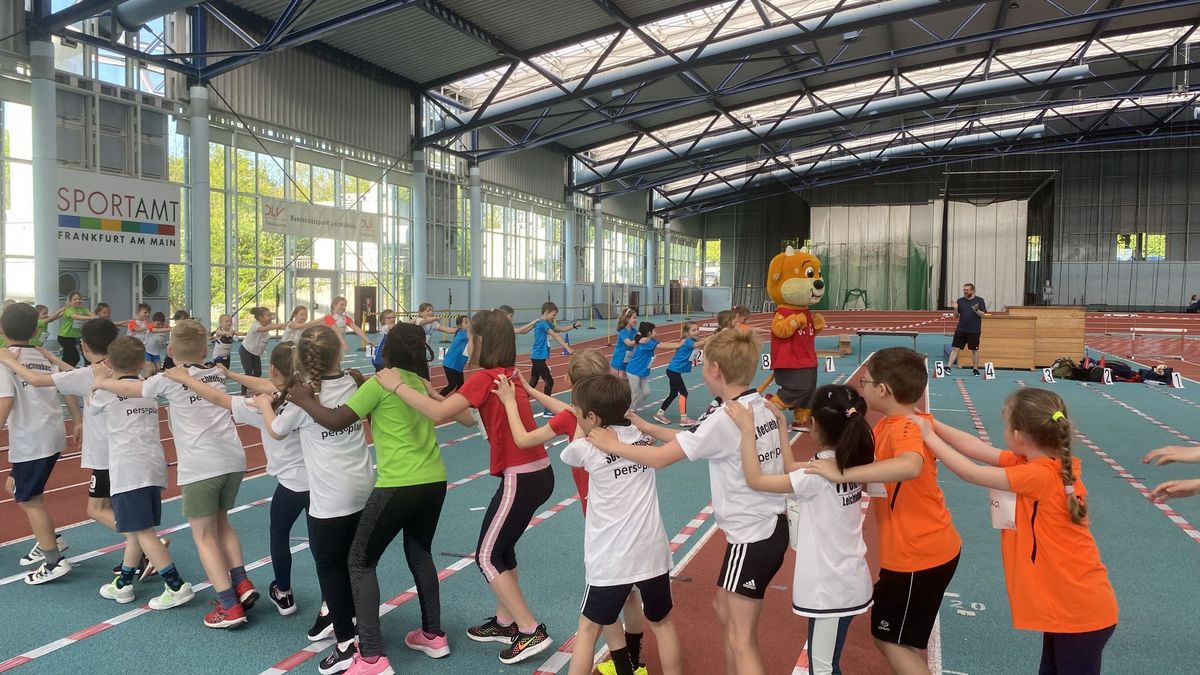 Es waren 16 Teams und somit über 140 Kinder gemeldet, die nun fünf Kinderleichtathletik-Disziplinen vor sich hatten. Als um 10 Uhr der Startschuss in der Leichtathletikhalle Kalbach ertönte, war es an den Kindern zu zeigen, was sie in ihrem jungen U10 Alter schon können. Als erstes wurde die ganze Leichtathletikhalle hergerichtet, so dass 8 Teams gleichzeitig die Hindernis-Sprintstaffel bestreiten konnten - ein beeindruckendes Bild. Nachdem das geschafft war, blieben noch der Drehwurf, das Medizinballstoßen und die Weitsprung-Staffel, bis abschließend der Team-Biathlon anstand. Die Atmosphäre war dank motivierter Kinder, gut gelaunter Eltern und toller Musik perfekt. Außerdem war das DLV-Maskottchen JuLe anwesend und sorgte für Stimmung. Alles in allem ein gelungener KiLa-Wettkampf - doch für die C-Trainer*innen war die Arbeit noch nicht getan.