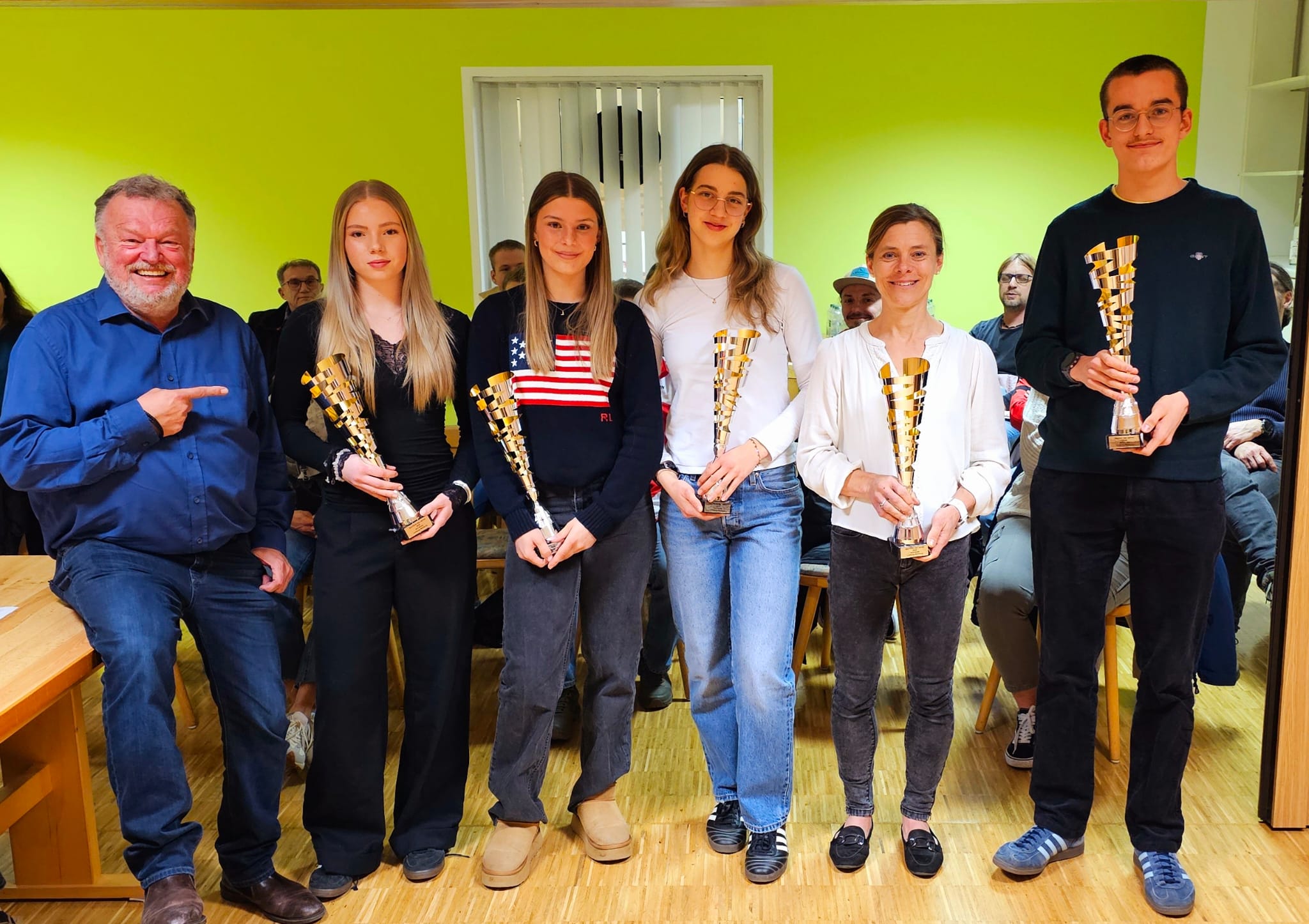 Die Sportler des Jahres 2024 wurden in Vertretung des erkrankten Sportwartes Josef Schmitz von Peter Köth geehrt, der neben seinem Amt als zweiter Vorsitzender des Kreises auch der sportliche Leiter des Fördervereins ist und so die Sportler sehr gut kennt. Bei den Schülerinnen wurden gleich zwei geehrt, da man sich im Vorstand einig war, dass beide diese Wahl verdient haben. Polly Nierfeld von der LSG Goldener Grund Selters und Marleen Simon von der LG Dornburg bekamen den Pokal für ihre herausragenden Leistungen. Polly als 4. Der Deutschen Meisterschaft im Hammerwurf und Marleen als herausragende Hürdenläufern. Der Schüler des Jahres Felix Fliegner (LSG) konnte aufgrund einer Klassenfahrt nicht teilnehmen. Bei den Jugendlichen viel die Wahl ganz klar auf Johann Escher von der TG Camberg, der als Hessenmeister im Berglauf und mit seinen tollen Ergebnissen auf 5 und 10km auf sich aufmerksam machte. Sportlerin des Jahres bei der weiblichen Jugend ist natürlich Ina Ehrmann von der LG Dornburg. Ina war eigens aus Frankfurt zum Kreistag angereist – sie wohnt dort im Sportinternat – und wurde nochmal für ihre Deutsche Vizemeisterschaft herausgestellt. Bei den Männern ist Lukas Glöckner von der LSG der Sportler des Jahres, er war leider wegen einer Familienfeier verhindert. Friederike Schoppe (ebenfalls LSG Goldener Grund Selters) wurde für ihre herausragenden Erfolge auf der Marathonstrecke mit dem Gewinn der Hessenmeisterschaft bei den Frauen in 2024 geehrt und freute sich sehr über den tollen Pokal.