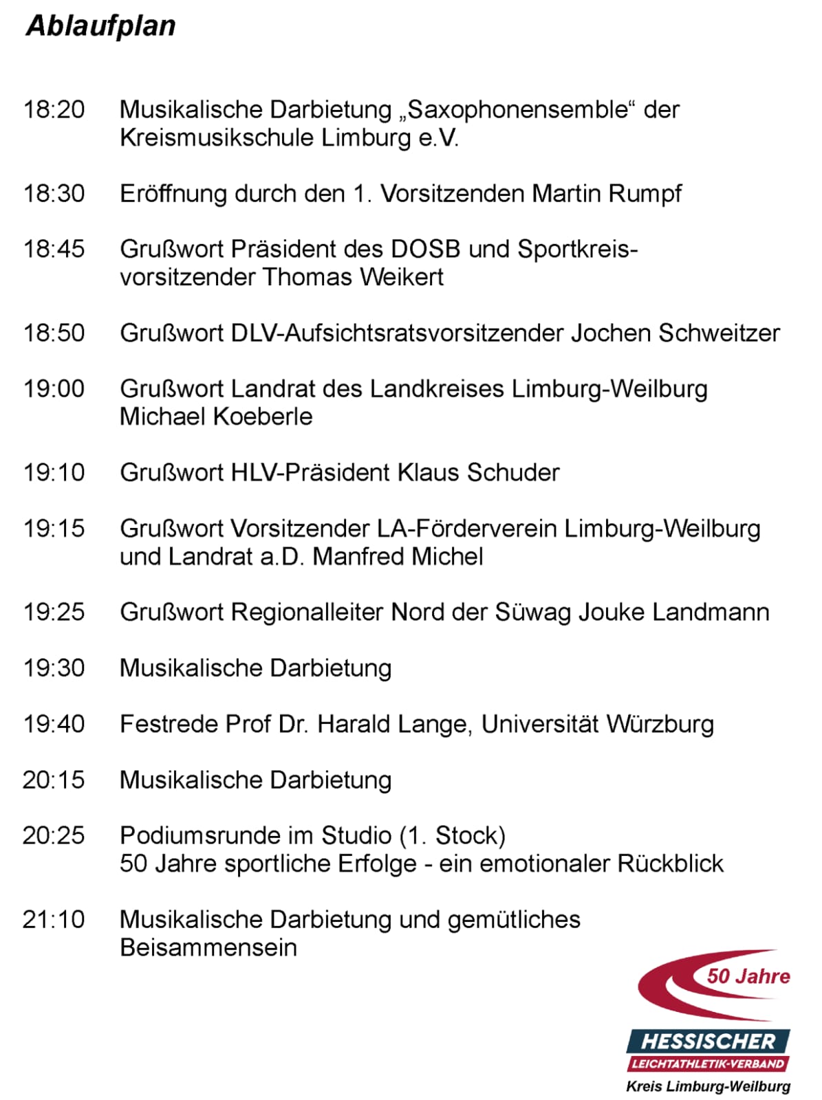 Neben findet Ihr den Zeitplan für die heutige 50 Jahr Feier.